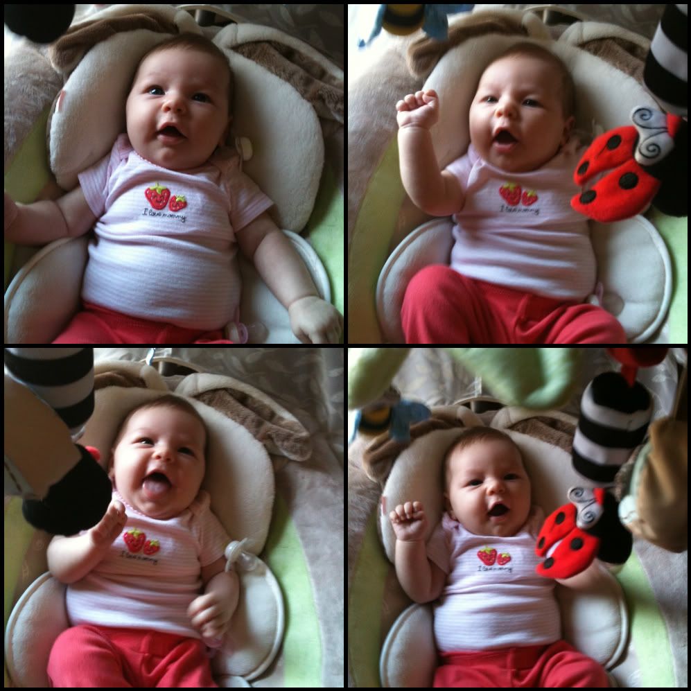 Speaking of STUFF. Autumn has these bugs. There are three of them, a ladybug (her favorite), a butterfly, and a bee. They dangle so you can attach them to the carseat or mobile or wherever, and they also make jingle noises. They have those colors babies love and she will i swear stare at these things for a couple hours straight. I hung them from her swing mobile and now she recognizes them and smiles when I put her in her swing. Sometimes she "talks" to them and silent laughs. its too cute.